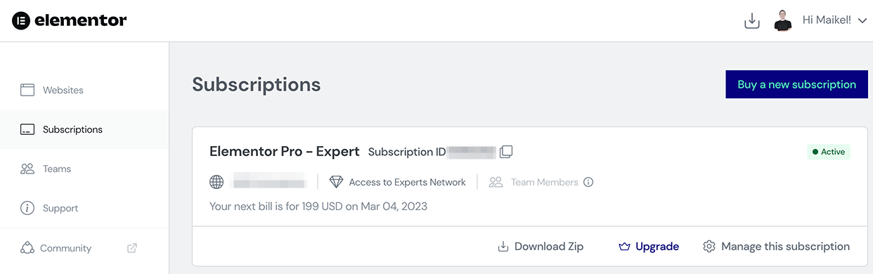 In je account kun je naar Subscriptions gaan om Elementor Pro te downloaden, te upgraden naar een hoger plan of je abonnement te beheren.