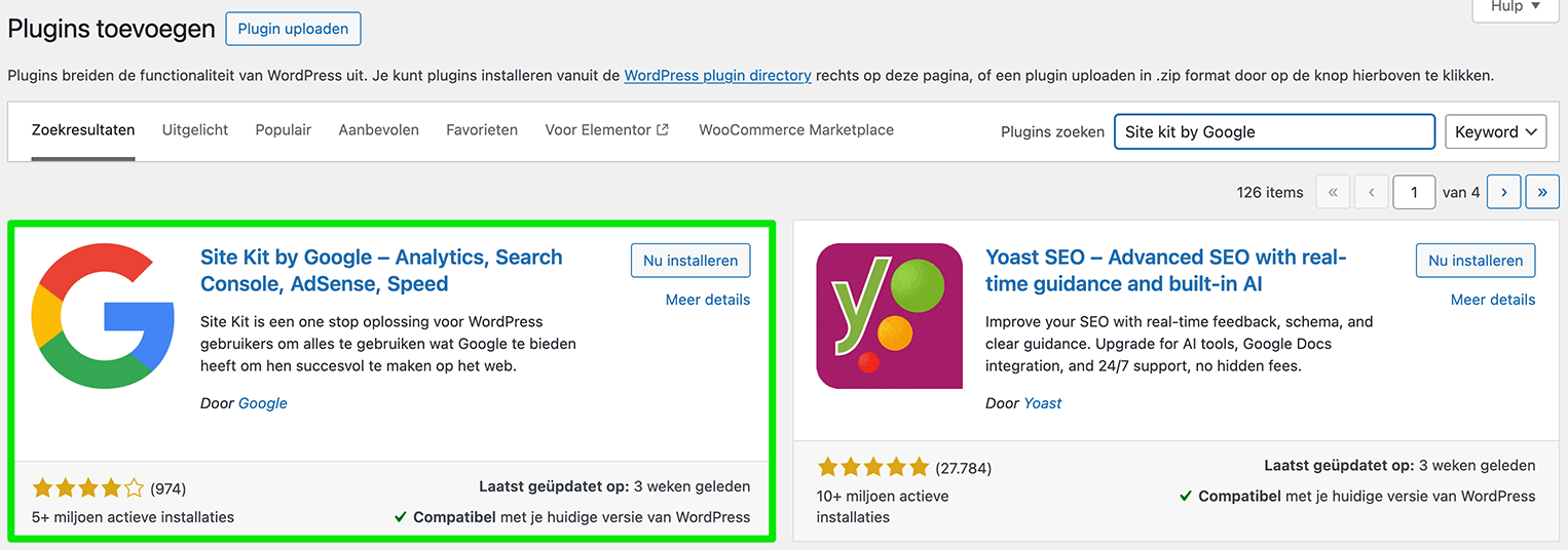 Log in op je WordPress dashboard en ga naar Plugins → Plugin toevoegen. Zoek hier naar Site Kit by Google en installeer de plugin door op ‘nu installeren’ te klikken.