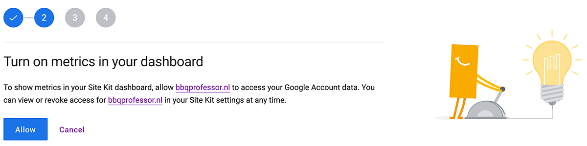 Je ziet dat we 4 stappen te gaan hebben, maar eigenlijk is het elke keer toestaan dat Google iets voor je regelt. Nu wordt gevraagd of je website toegang mag krijgen tot je Google Account data, zodat Google Analytics data in WordPress getoond kan worden.