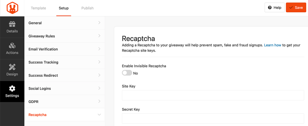 Als laatste optie bij de instellingen hebben we Recaptcha. Hiermee kun je spam en fake inschrijvingen voor de winactie voorkomen.