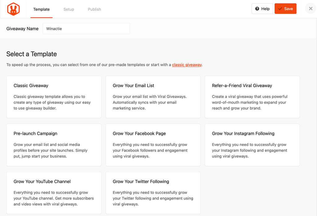 Je kunt vervolgens een template uitkiezen die je wilt gebruiken als winactie. Bovenaan bij Giveaway name vul je de naam in van je winactie. Daaronder kun je een template kiezen.