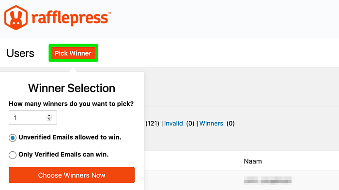 Wanneer je dit hebt ingevuld kun je op Choose Winners Now klikken. RafflePress zal nu willekeurig de winnaars van je winactie tonen, zodat alles eerlijk verloopt. De winnaars worden uitgelicht bovenaan de lijst met gebruikers weergegeven.