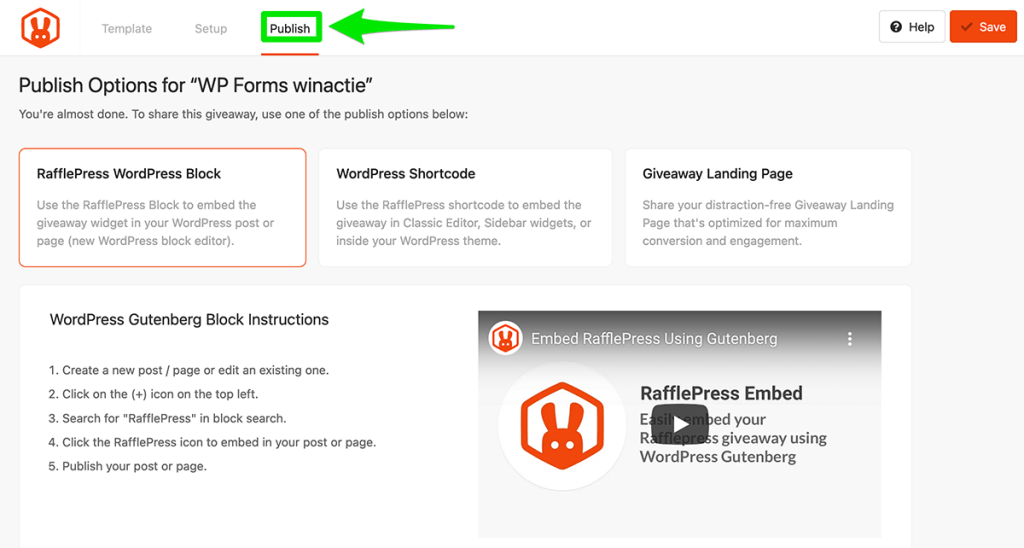 Nu je alles volledig hebt ingesteld, is het zaak om je winactie kenbaar te maken op je website. Klik bovenaan op Publish.