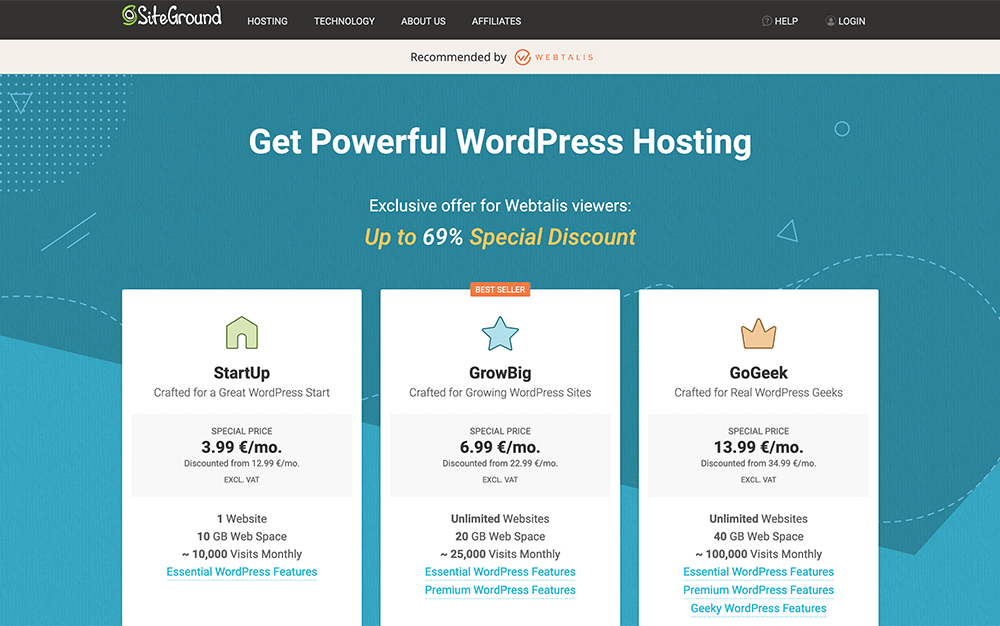 SiteGround heeft 3 verschillende pakketten. Het goedkoopste pakket kost €3,99 per maand. Je krijgt hier 10GB opslagruimte, kunt 1 website erop plaatsen en ongeveer 10.000 bezoekers per maand ontvangen zonder performance verlies. Daarna kun je beter upgraden. Op de hogere websites kun je ook meer websites plaatsen.