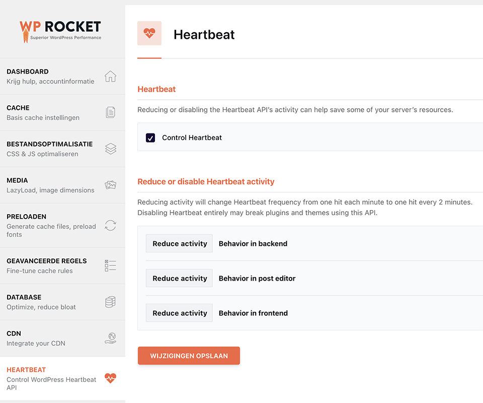 Wanneer je WP Rocket gebruikt kun je eenvoudig de frequentie verminderen of zelfs helemaal uitschakelen. Je doet dit via het Heartbeat tabblad.