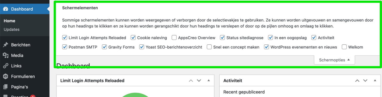 Om zo min mogelijk informatie op een pagina te tonen kun je rechtsboven naar de Schermopties gaan. Op de dashboardpagina kun je simpelweg vinkjes weghalen bij de diverse schermelementen die getoond worden.